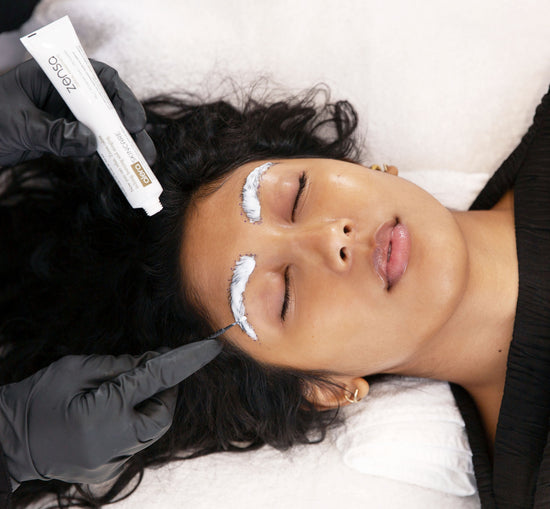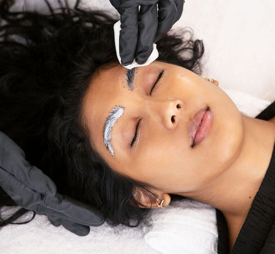 Complete your brow mapping, then use a spoolie to exfoliate the brows. Next, use a sterile applicator to apply a half-inch thick layer of cream to the area. Do not rub into skin.